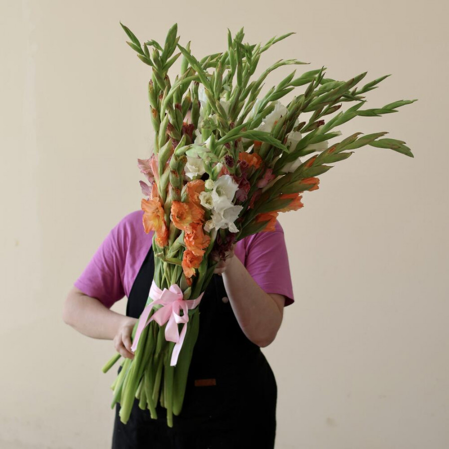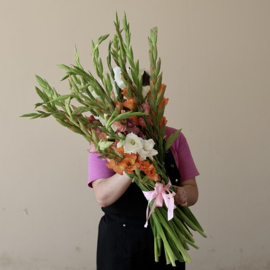 На фото букет из 25 микс гладиолусов. В составе: гладиолус 25 шт, атласная лента 1 шт, . Все цветы свежие и ароматные, букет красиво оформлен и отлично подходит для подарка. Доступна доставка цветов или самовывоз.