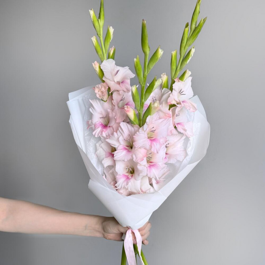 На фото букет из 3 розовых гладиолуса. В составе: гладиолус 3 шт, дизайнерская упаковка 1 шт, атласная лента 2 шт, . Все цветы свежие и ароматные, букет красиво оформлен и отлично подходит для подарка. Доступна доставка цветов или самовывоз.