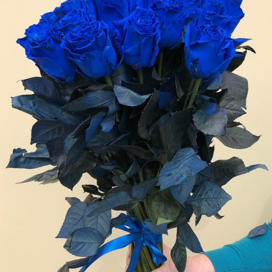 31 насыщенно-синяя роза в аккуратной голубой упаковке, лента в тон. Длина стебля на выбор: 45 или 70 см.
