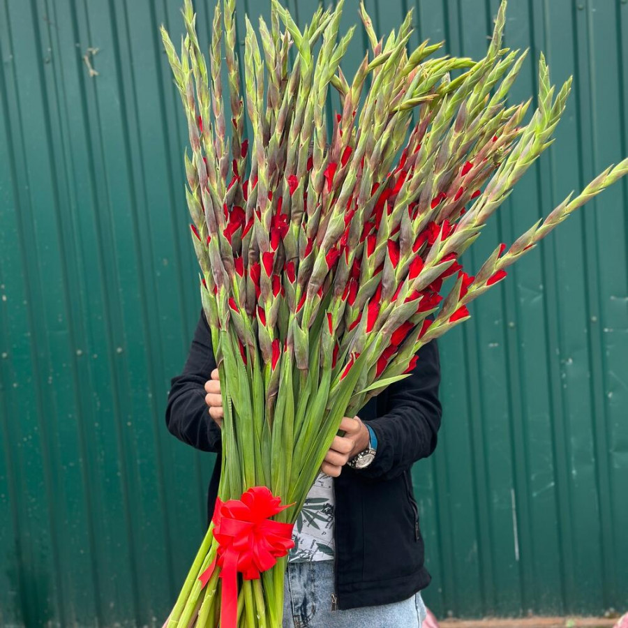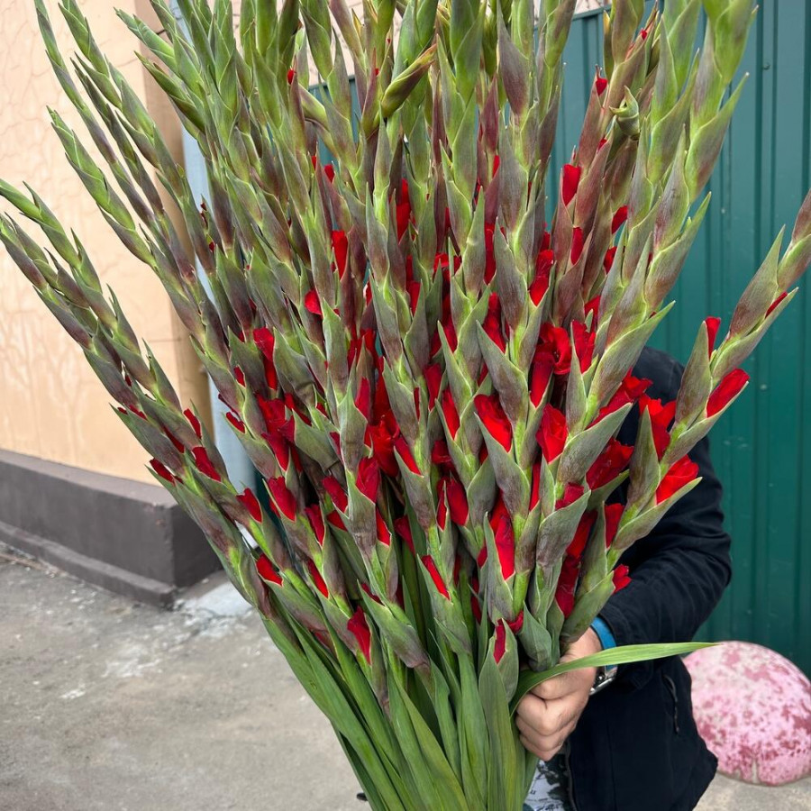 На фото букет из 49 красных гладиолусов. В составе: гладиолус 49 шт, атласная лента 1 шт, . Все цветы свежие и ароматные, букет красиво оформлен и отлично подходит для подарка. Доступна доставка цветов или самовывоз.