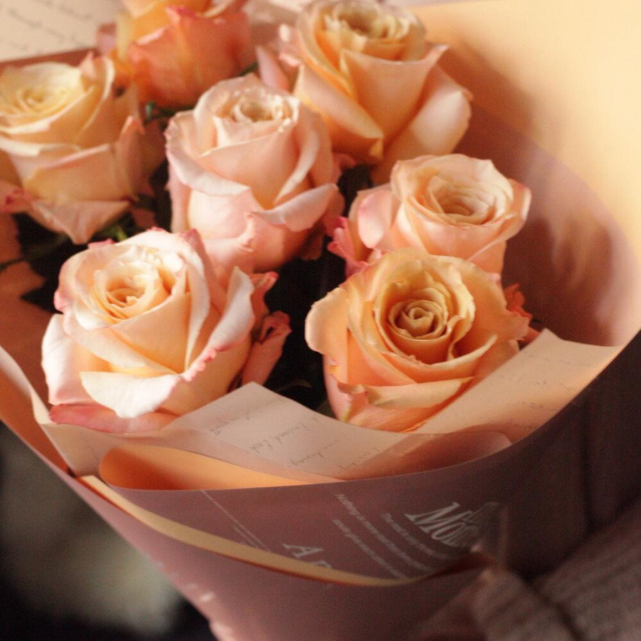На фото букет из 7 персиковых роз. В составе: роза 7 шт, дизайнерская упаковка 1 шт, атласная лента 1 шт, . Все цветы свежие и ароматные, букет красиво оформлен и отлично подходит для подарка. Доступна доставка цветов или самовывоз.