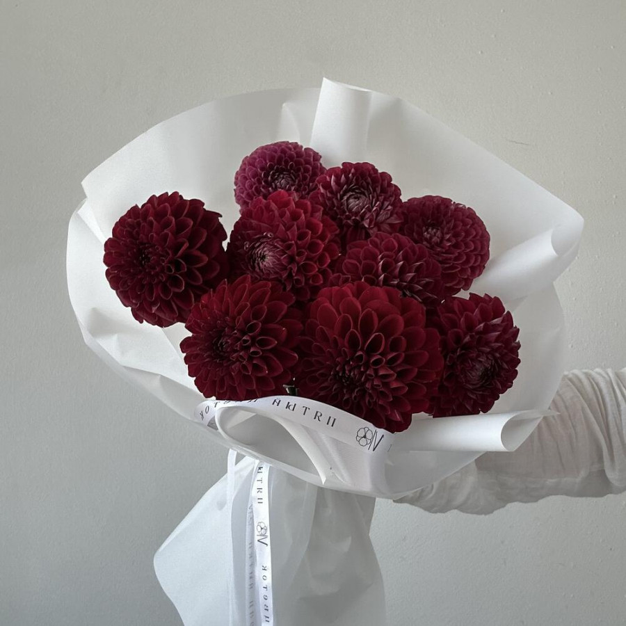 На фото букет из 9 бордовых георгин. В составе: георгина 9 шт, дизайнерская упаковка 2 шт, атласная лента 1 шт, . Все цветы свежие и ароматные, букет красиво оформлен и отлично подходит для подарка. Доступна доставка цветов или самовывоз.