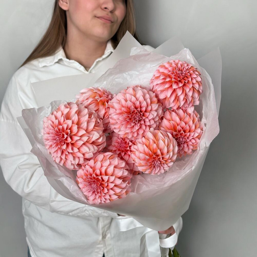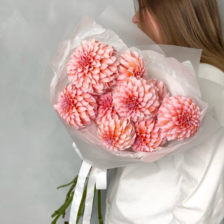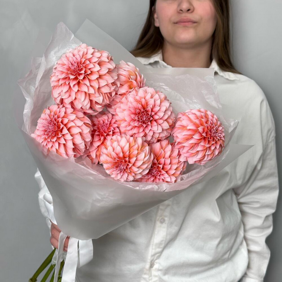 На фото букет из 9 персиково-розовых георгин. В составе: георгина 9 шт, дизайнерская упаковка 3 шт, атласная лента 2 шт, . Все цветы свежие и ароматные, букет красиво оформлен и отлично подходит для подарка. Доступна доставка цветов или самовывоз.
