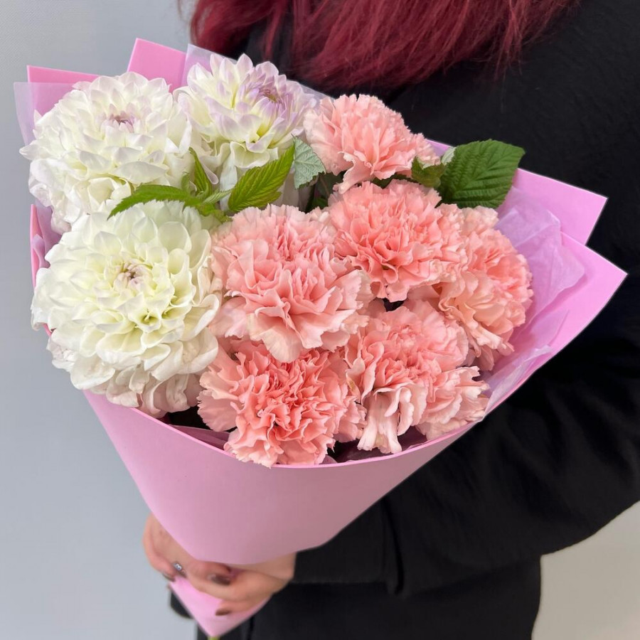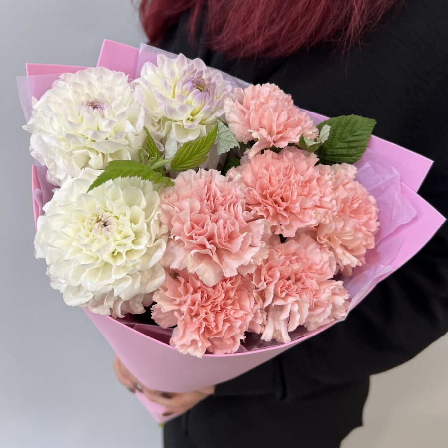 На фото букет из белых георгин и розовых гвоздик. В составе: георгина 3 шт, гвоздика 6 шт, зелень 2 шт, дизайнерская упаковка 1 шт, атласная лента 1 шт, . Все цветы свежие и ароматные, букет красиво оформлен и отлично подходит для подарка. Доступна доставка цветов или самовывоз.