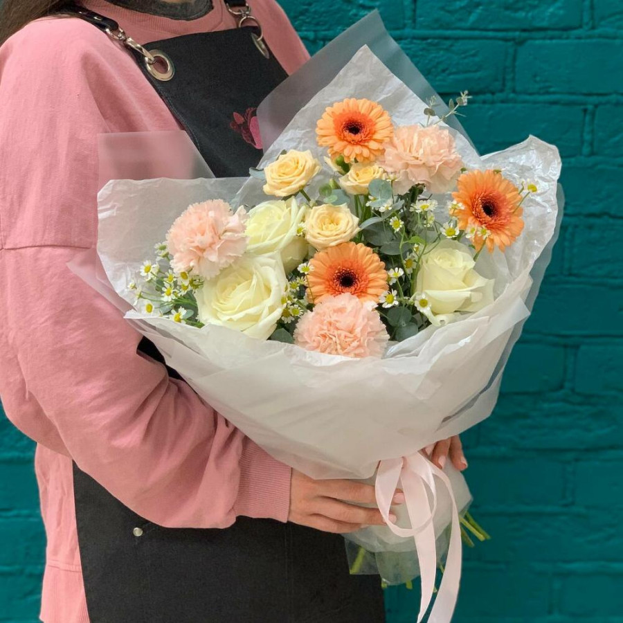 На фото букет «абрикосовый рассвет». В составе: роза 3 шт, кустовая роза 1 шт, гвоздика 3 шт, танацетум 3 шт, гербера 3 шт, писташ 2 шт, дизайнерская упаковка 1 шт, атласная лента 1 шт, . Все цветы свежие и ароматные, букет красиво оформлен и отлично подходит для подарка. Доступна доставка цветов или самовывоз.