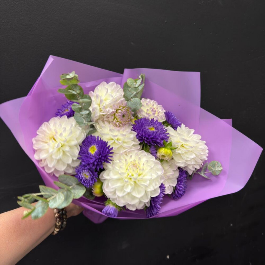 На фото букет из георгинов и астр. В составе: георгина 7 шт, астра 6 шт, эвкалипт 4 шт, дизайнерская упаковка 1 шт, атласная лента 1 шт, . Все цветы свежие и ароматные, букет красиво оформлен и отлично подходит для подарка. Доступна доставка цветов или самовывоз.