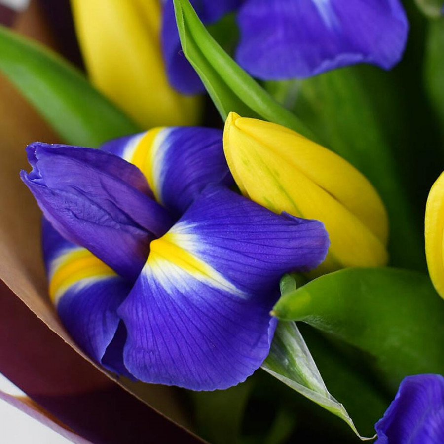 На фото букет из синих ирисов и желтых тюльпанов. В составе: ирис 15 шт, тюльпан 16 шт, крафт-бумага 1 шт, атласная лента 1 шт, . Все цветы свежие и ароматные, букет красиво оформлен и отлично подходит для подарка. Доступна доставка цветов или самовывоз.