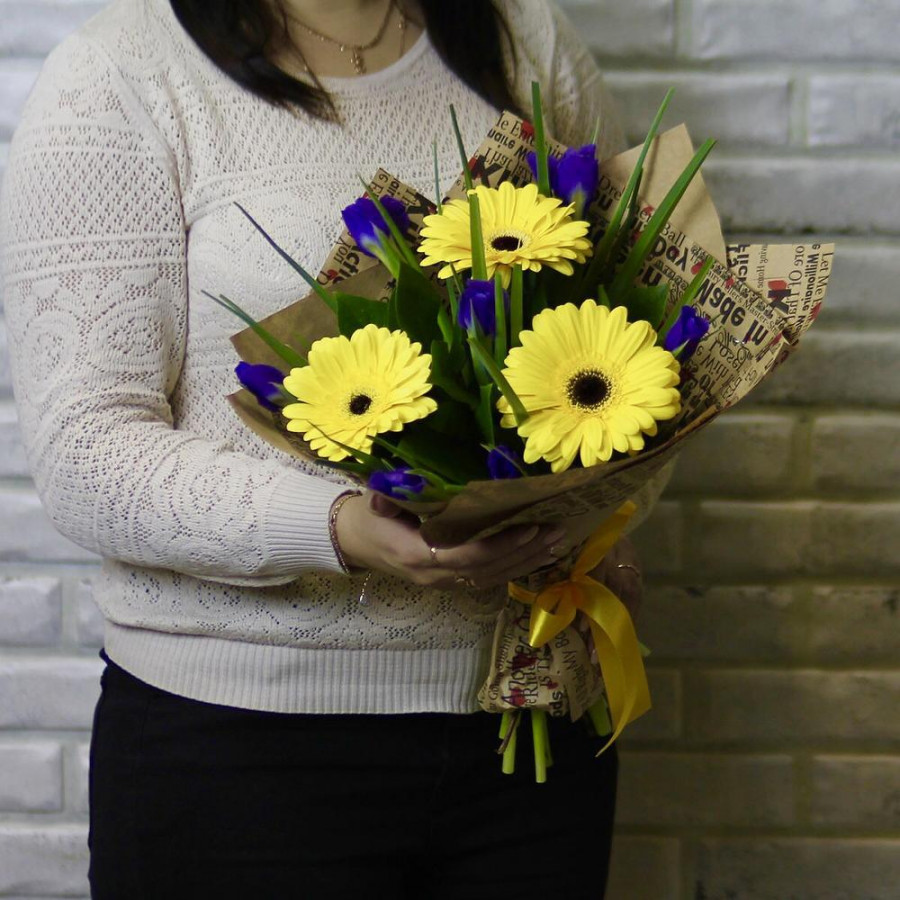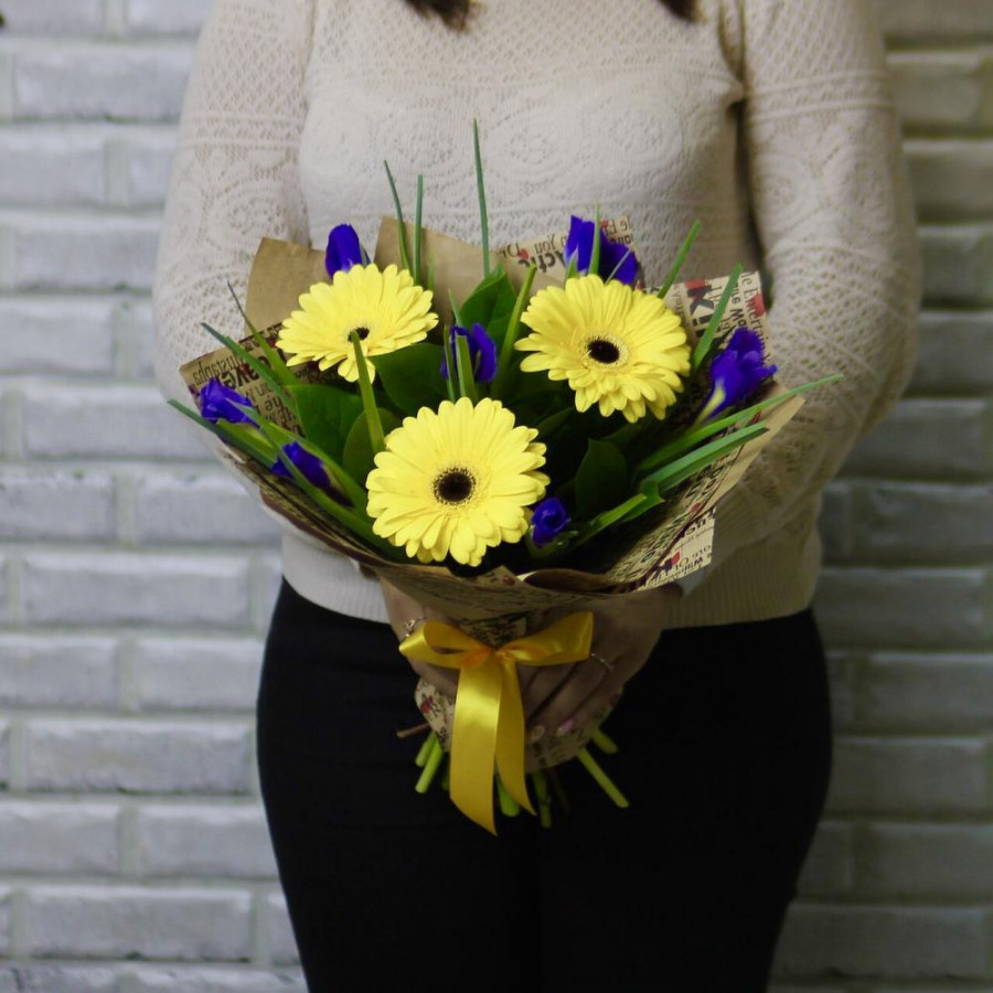Букет из желтых гербер с синими ирисами в Сарапуле