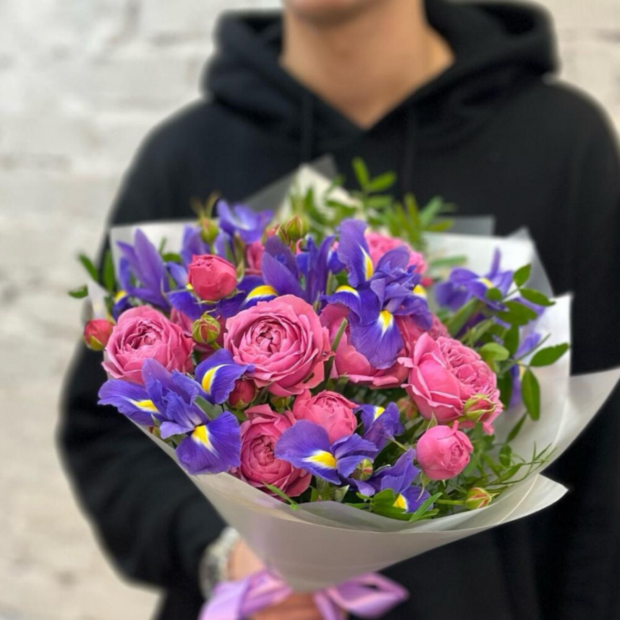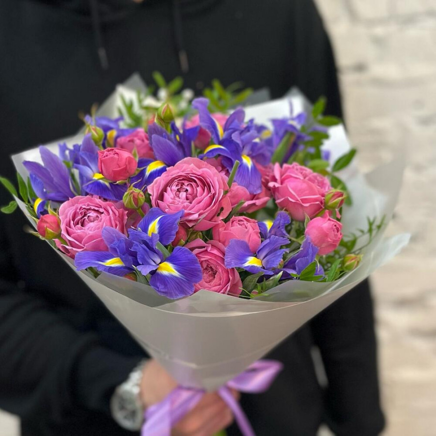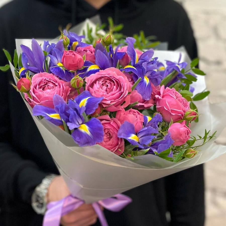 Букет из розовых пионовидных роз и синих ирисов в Сарапуле