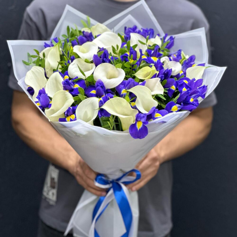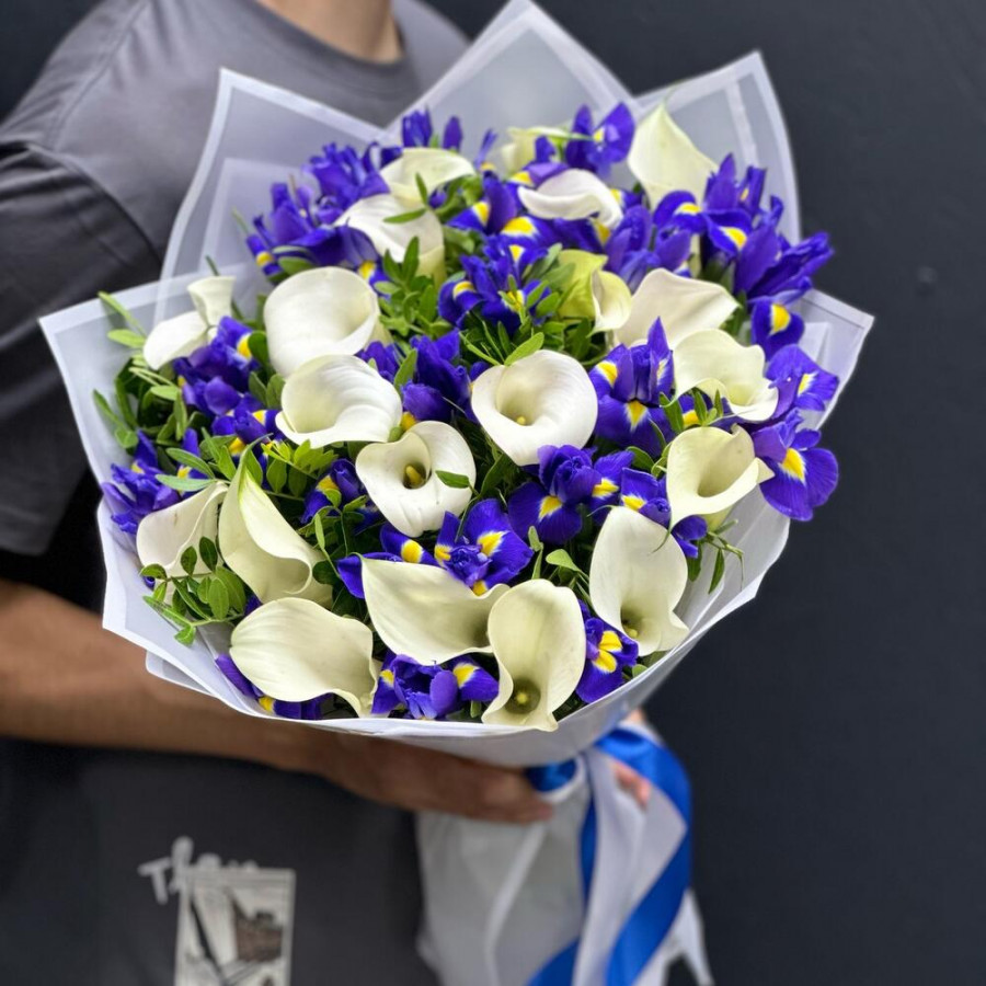 На фото букет из белых калл и синих ирисов. В составе: калла 19 шт, ирис 20 шт, писташ 9 шт, дизайнерская упаковка 3 шт, атласная лента 1 шт, . Все цветы свежие и ароматные, букет красиво оформлен и отлично подходит для подарка. Доступна доставка цветов или самовывоз.