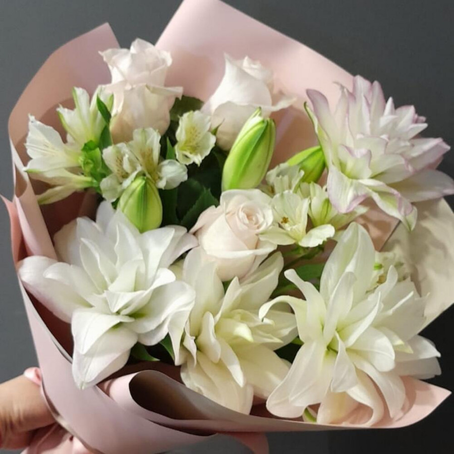 На фото букет «нежность в облаках». В составе: лилия 2 шт, роза 3 шт, альстромерия 2 шт, дизайнерская упаковка 1 шт, атласная лента 1 шт, . Все цветы свежие и ароматные, букет красиво оформлен и отлично подходит для подарка. Доступна доставка цветов или самовывоз.