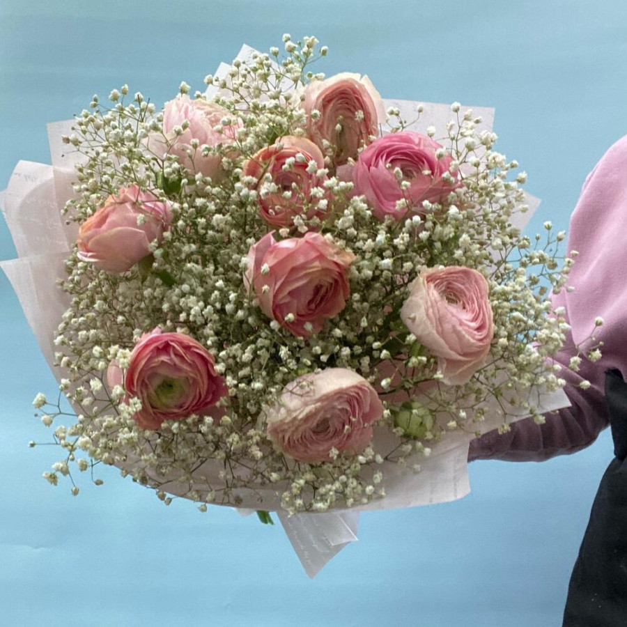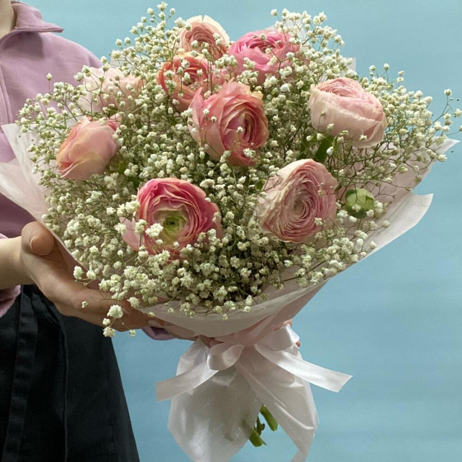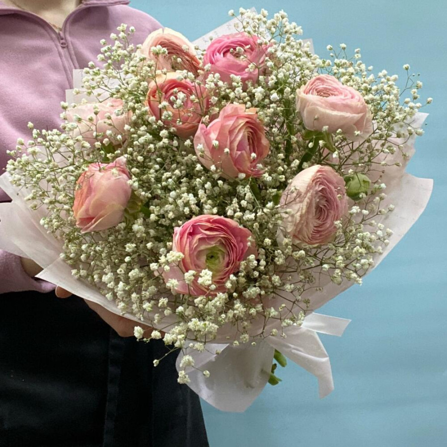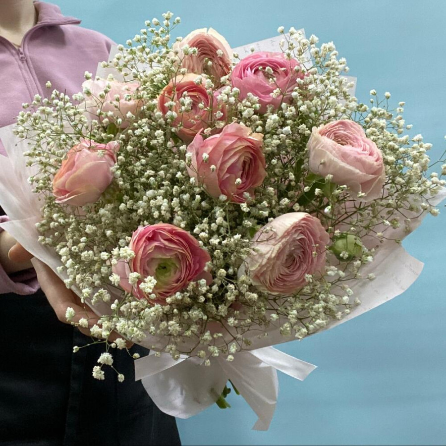 Букет из розовых ранункулюсов с белой гипсофилой в Сарапуле