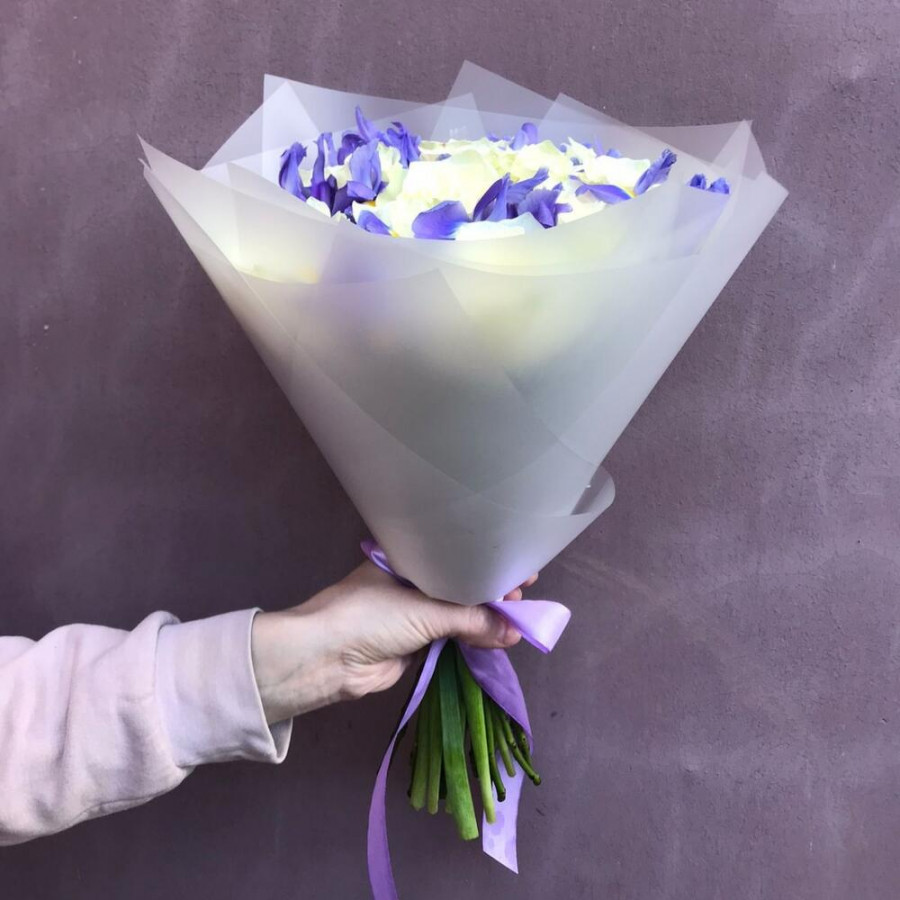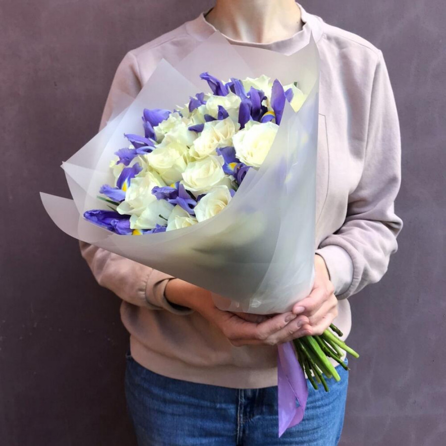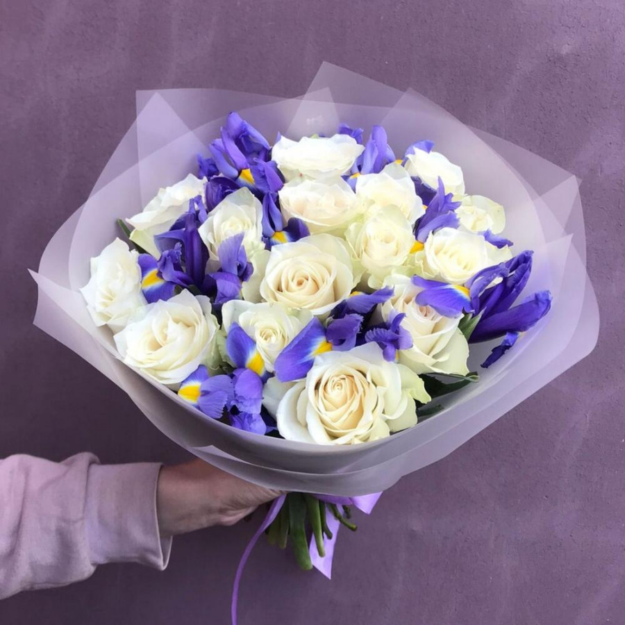 На фото букет из белых роз и синих ирисов. В составе: роза 15 шт, ирис 8 шт, дизайнерская упаковка 1 шт, атласная лента 1 шт, . Все цветы свежие и ароматные, букет красиво оформлен и отлично подходит для подарка. Доступна доставка цветов или самовывоз.