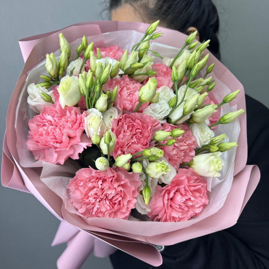 На фото букет «розовая нежность». В составе: гвоздика 10 шт, эустома (лизиантус) 3 шт, дизайнерская упаковка 2 шт, атласная лента 1 шт, . Все цветы свежие и ароматные, букет красиво оформлен и отлично подходит для подарка. Доступна доставка цветов или самовывоз.