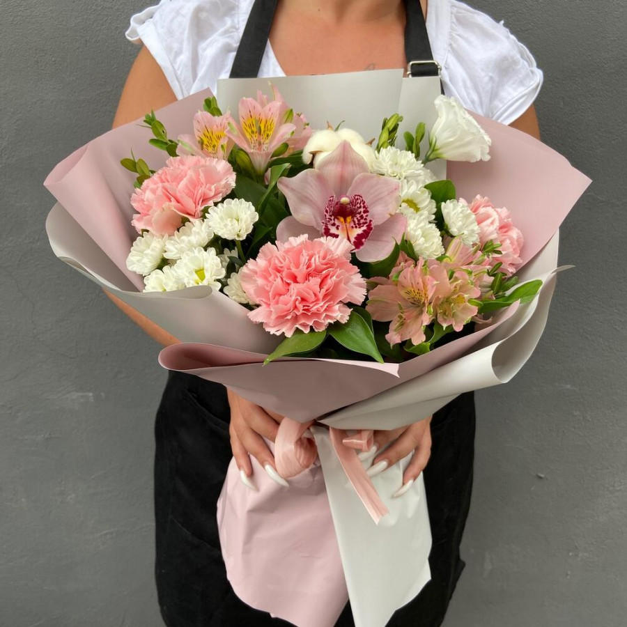 На фото букет «светлый шепот». В составе: альстромерия 2 шт, хризантема кустовая 2 шт, орхидея 1 шт, эустома (лизиантус) 1 шт, хлопок 1 шт, дизайнерская упаковка 1 шт, атласная лента 1 шт, . Все цветы свежие и ароматные, букет красиво оформлен и отлично подходит для подарка. Доступна доставка цветов или самовывоз.