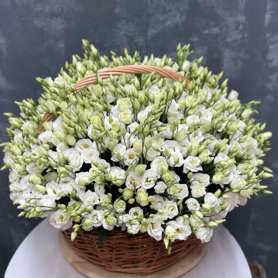 На фото корзина из 101 белой эустомы. В составе: эустома (лизиантус) 101 шт, корзина (xl) 1 шт, . Все цветы свежие и ароматные, букет красиво оформлен и отлично подходит для подарка. Доступна доставка цветов или самовывоз.